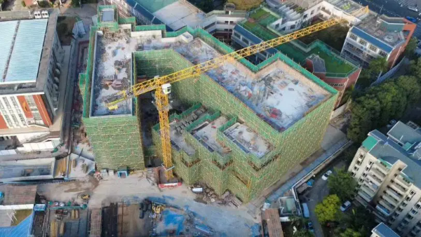 目前高一组团正大面积开展室内精装修,高二、高三组团已全面插入砌体工程,多作业面同步推进、多工序有序衔接。面对各类施工挑战,项目团队多措并举,以智造支撑全流程追踪,采用高空悬挑模架体系、盘扣架高强度双托梁支撑体系。