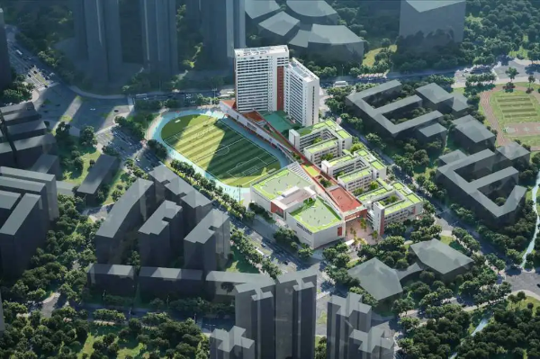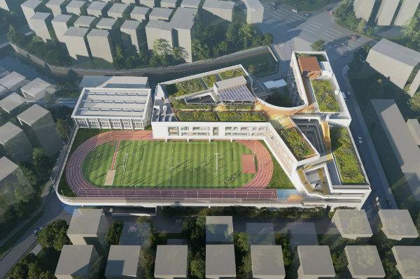 作为高密度环境下的校园扩容项目,采取“层叠式”设计逻辑,垂直分布教学、运动、公共活动功能:地下及低楼层置入大跨度剧场与体育场馆,中层设置标准教学区,顶层打造屋顶生态教学基地。通过对场地潜力的极限挖掘,将原本的“插缝地”转变为高产出的“教学矩阵”,破解老城区校园土地资源匮乏的困局,为高密度校园扩建提供集约化设计范式。