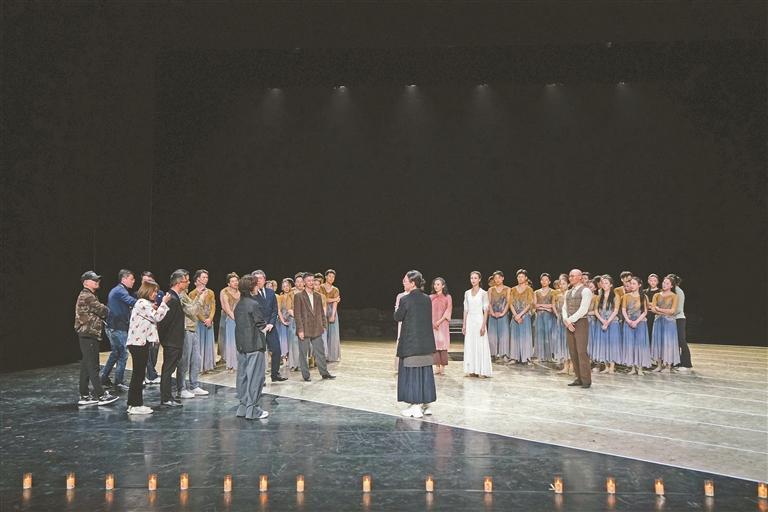 舞剧《记忆深处》国际版总编导与演员在舞台上沟通交流。