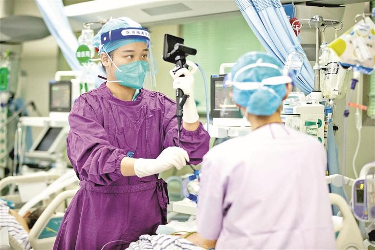 ▲区中心医院ICU医护人员精心护理患者。