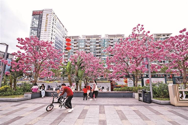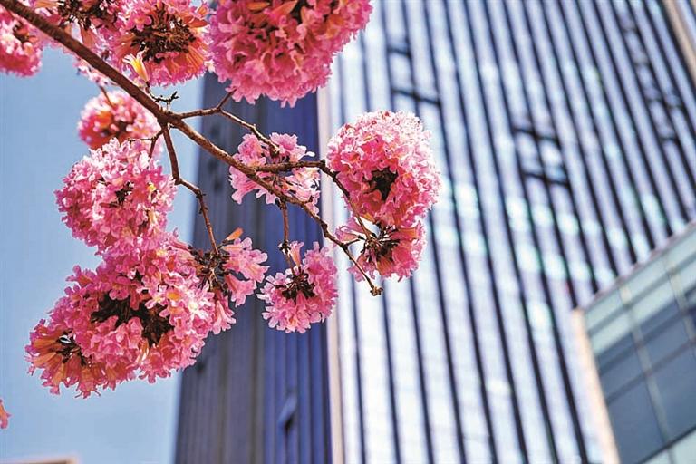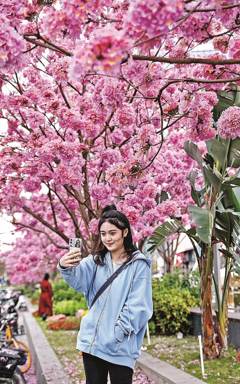 在东环二路ICO花漾街区,数十株长势良好的紫花风铃木恰逢花期,粉紫色的花球灿然绽放,街头成了浪漫的粉色花海。见此美景,不少市民驻足流连,欣赏之余还不忘拿出手机将美景定格,也有不少人站在花海下拍照打卡,留下美美的纪念照。