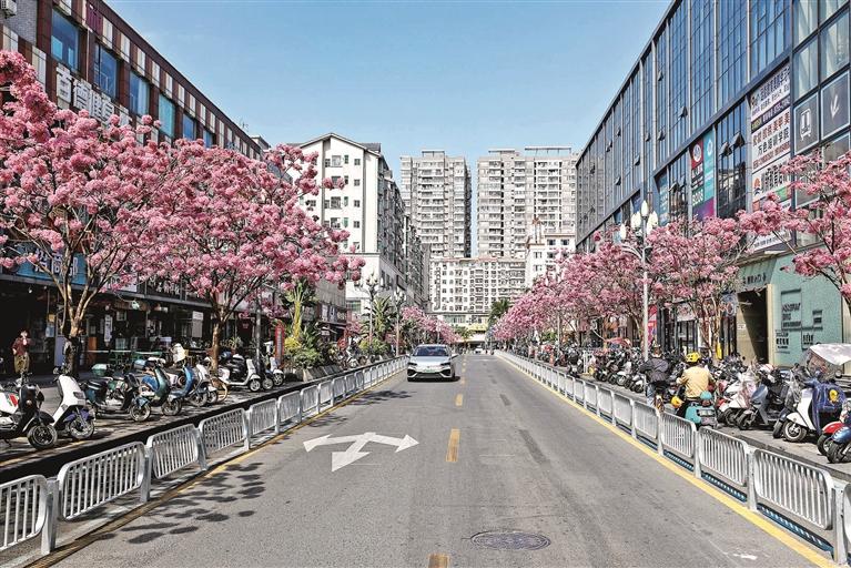 龙华大道打造了层次丰富的绿化景观,冬日暖阳下,道路中央绿化带的紫花风铃木恣意“喷发”,从金龙路路口到布龙路路口,绵延数公里,饱满艳丽的花球与街头高挂的红灯笼相映成趣,将龙华大道装扮得更加大气美观。