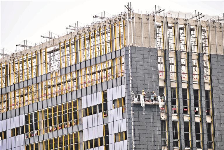 普门科技总部大厦项目,工人们忙着外墙的施工。