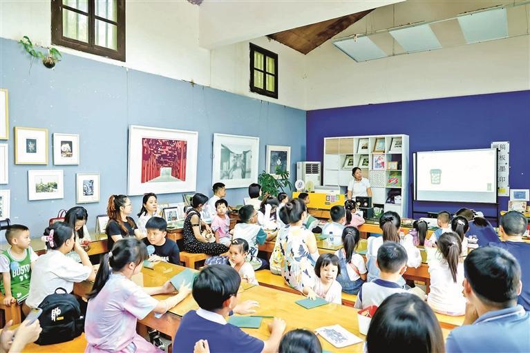 “当传统版画遇上垃圾分类,会有什么样的美妙邂逅呢?”26组亲子家庭在版画村落探寻古村雅韵,感受艺术熏染,赏景赏画赏艺术,实践体验秀分类。齐凤阁版画史学馆坐落在一片版画工作室之间,各组亲子家庭在工作人员的带领下前往史学馆欣赏了琳琅满目的版画作品。随后,在版画工坊,孩子们展开奇思妙想的翅膀,用一支笔,一张纸,一份油墨体验版画制作,围绕“让垃圾分类成为新时尚”主题,在专业老师的指导下,将可爱的芬芬形象、垃圾分类等元素通过画稿、刻板、滚墨、印刷的步骤刻画在宣纸上,实现了传统文化与分类时尚的融合,尽显版画美工的魅力。