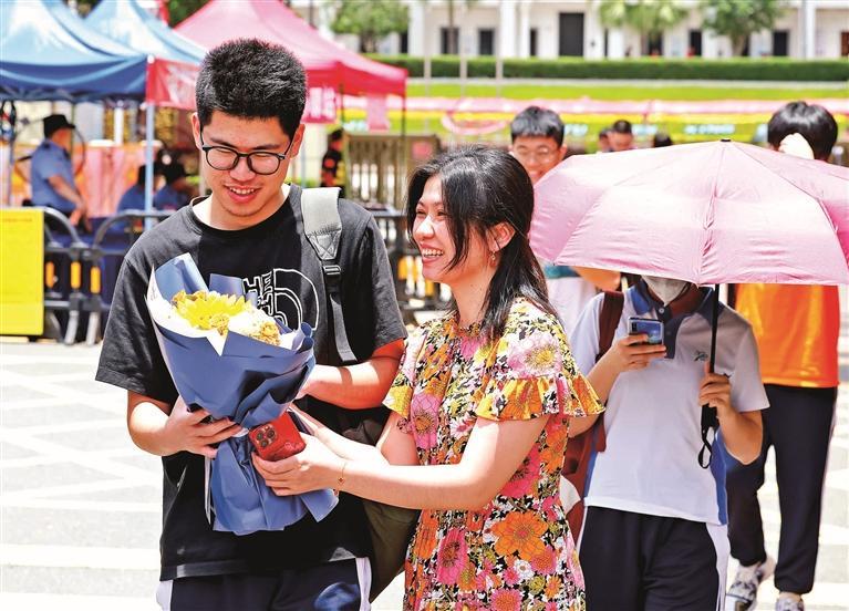 在龙华中学考点外看到,现场已有不少家长、老师在焦急等候。看着考生们一个个笑容洋溢地走出考场,父母亲友们第一时间送上鲜花与祝福,或是深情拥抱分享喜悦,或是用相机记录下这一重要时刻,以此祝贺他们顺利完成这一场“人生大考”。