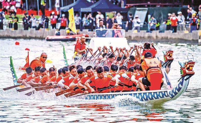 随着发令枪声响起,现场顿时船鼓齐擂,吼声震天,组组蛟龙如离弦之箭迸发向前。16支国内外龙舟专业代表队,以及于19日比赛中闯进决赛的机关企事业组、社区组的各4支队伍奋勇争先,竞渡观澜河。此外,各项赛事中穿插精彩的文化节目展演,既有舞龙、醒狮、舞麒麟、客家山歌、潮汕英歌舞、非遗“鱼灯”等传统文化活动,也有充分结合时下年轻人所喜爱的“国风潮”,以诗歌吟诵、国乐、汉服展示等形式进行的舞台表演。