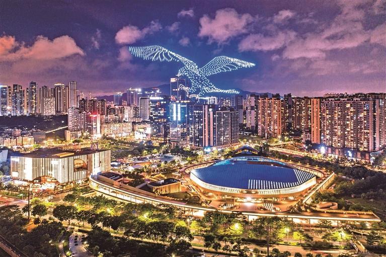 ▲无人机编队飞行表演点亮龙华夜空,展示低空经济魅力。