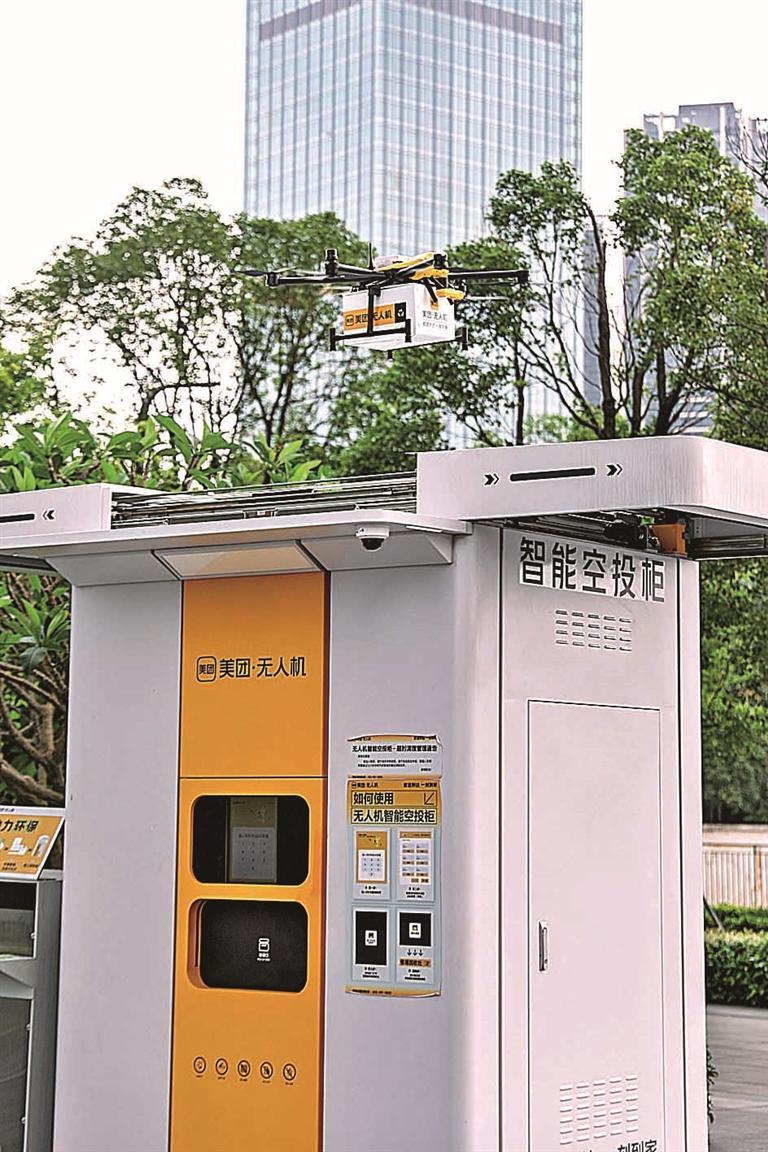 ▲美团无人机将外卖投送至无人机航线智能空投柜。