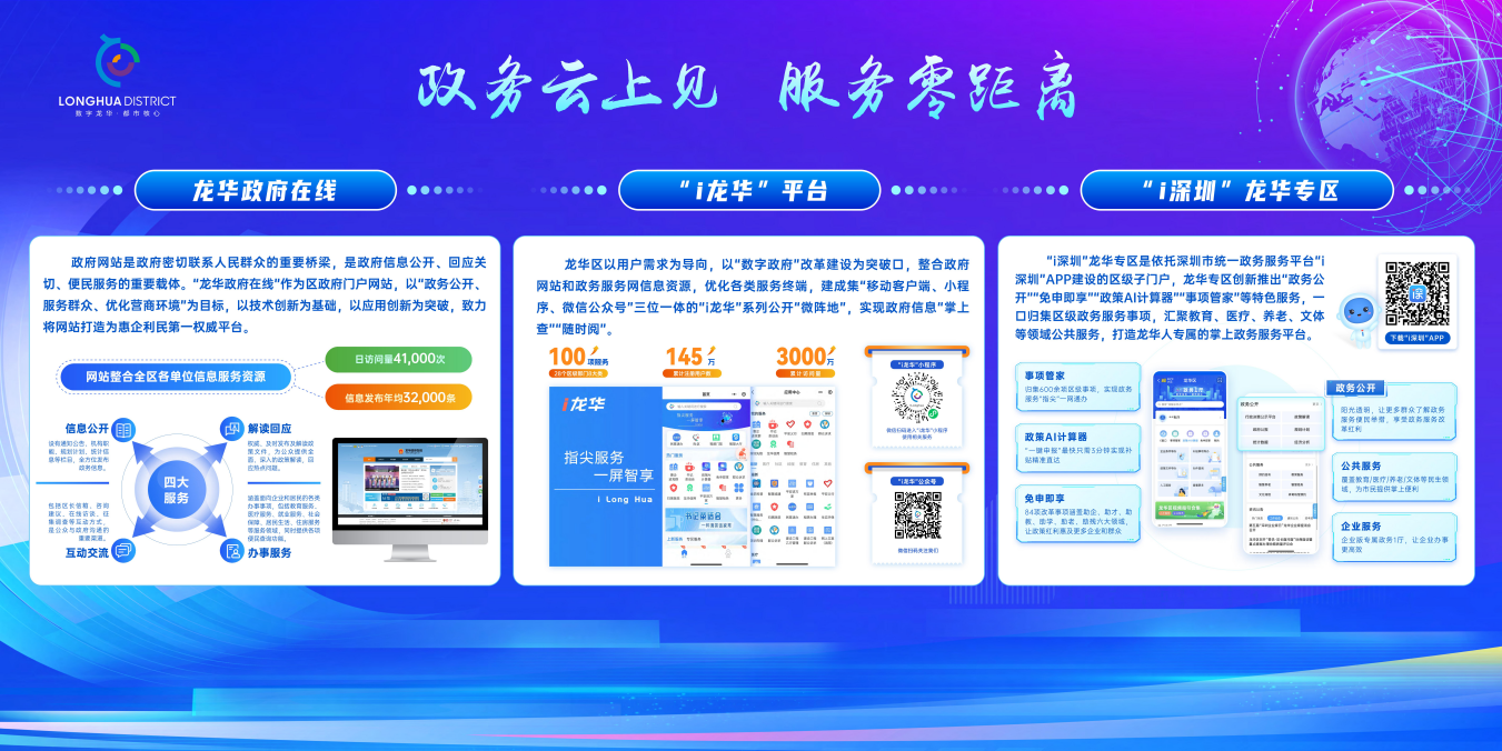 突破时间和空间的限制,将数字化能力融入到政务实践的场景中。龙华区政务公开不断加强“双语多端”政府网站与新媒体平台联动建设,从信息发布、解读回应、互动交流、办事服务等方面着力,构建了以政府网站为主、i龙华、i深圳龙华区级门户等政务新媒体渠道为支撑的“一网多端”公开平台,实现政府信息“网上查”“掌上阅”。在全市率先推行的“免申即享”与“政策AI计算器”,实现政策直达快享。目前共推出四批84项“免申即享”事项清单,兑现政策红利14.18亿元,惠及52万企业和群众,实现四个“全省之最”(补贴金额全省最大、事项数量全省最多、事项覆盖范围全省最广、惠及群众全省最众)。