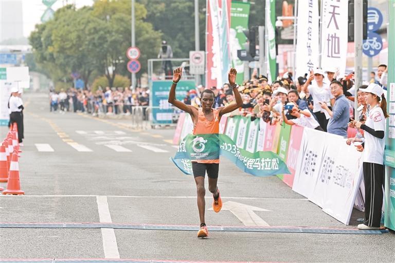 2023深圳龙华半程马拉松男子组冠军、女子组冠军冲线。