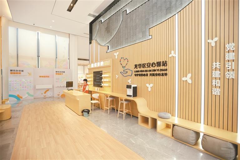 安心驿站总建筑面积800平方米,遵循“一心一驿,安心龙华”设计理念,分两层布局,“动静区域”分明。一层趣味开放,设置悦读时光阅心区、智能科技愉心区、知性女性舒心区、儿童游乐悦心区四大公共区域,并衔接户外活力沁心跑道;负一层静心私密,配套暖心咨询室、宽心解压室、舒心释放室、静心冥想室、安心体检室、怡心棋画室六大功能室。驿站集心理辅导、活动沙龙、静心疗愈等特色功能于一体,服务青工、新就业以及青少年和老年人等群体,旨在提高居民群众心理健康服务水平,满足居民群众心理健康服务需求,培育自尊自信、理性平和、积极向上的社会心态,营造“此心安处是吾乡”的氛围。驿站按照“四季可赏,环境美化”规划思路,驿站前规划由簕杜鹃、黄花风铃木、银桂、红千层组成的“安心林”,象征坚强自信、坚韧不拔、活力阳光的精神品质,起到安神、疗愈、调节身心状态的作用。