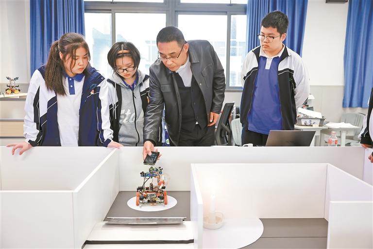 学生在李强的指导下,开展灭火机器人试验。