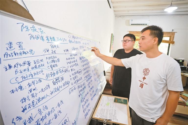 王兆宇(右)与参与拍摄《樟坑径24号》的本地青年进行讨论。