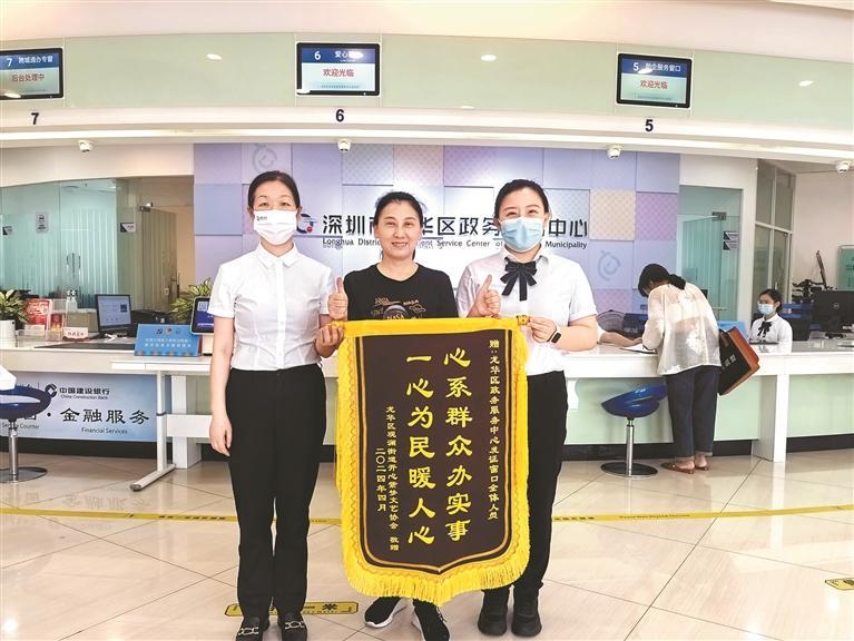 肖女士(中)向龙华政务服务中心赠送锦旗,感谢窗口工作人员的服务。