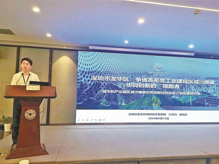 培训班上,龙华区作为试点城市代表,分享了减污降碳协同创新建设先进经验。深圳市生态环境局龙华管理局副局长江泽川以“深圳市龙华区:争做高密度工业建成区减污降碳协同创新的‘领跑者’”为主题,全面展示了龙华区减污降碳协同创新试点建设经验和案例成效。