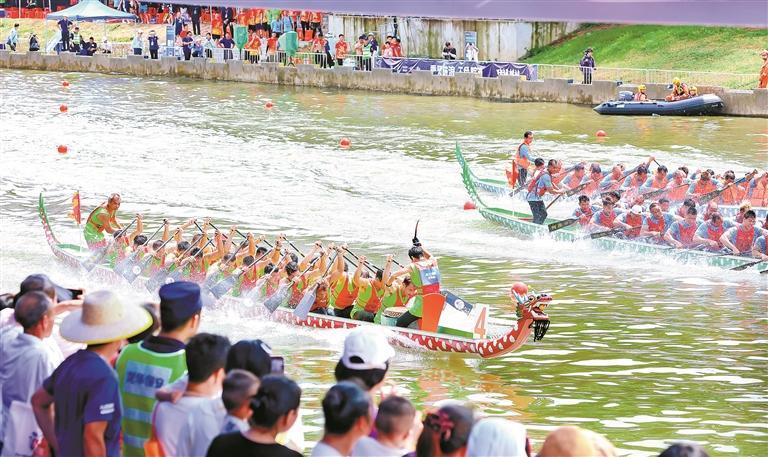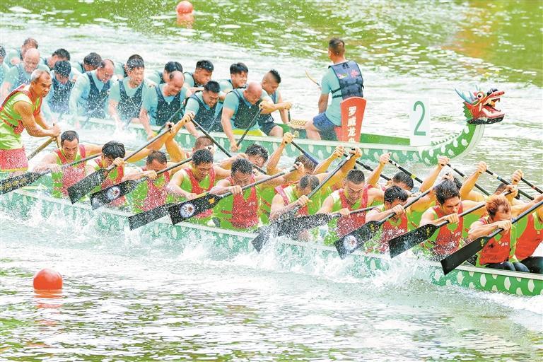 参赛队员挥桨如飞,岸边观众呐喊助威。