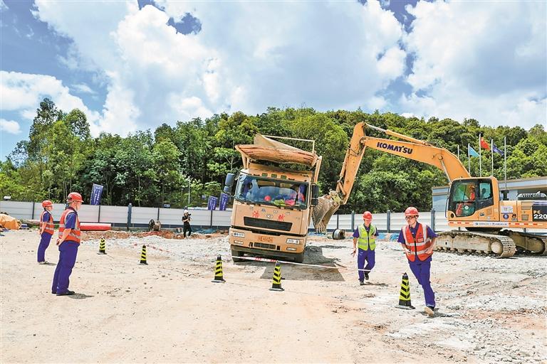 泥头车进出工地规范作业综合演练现场。