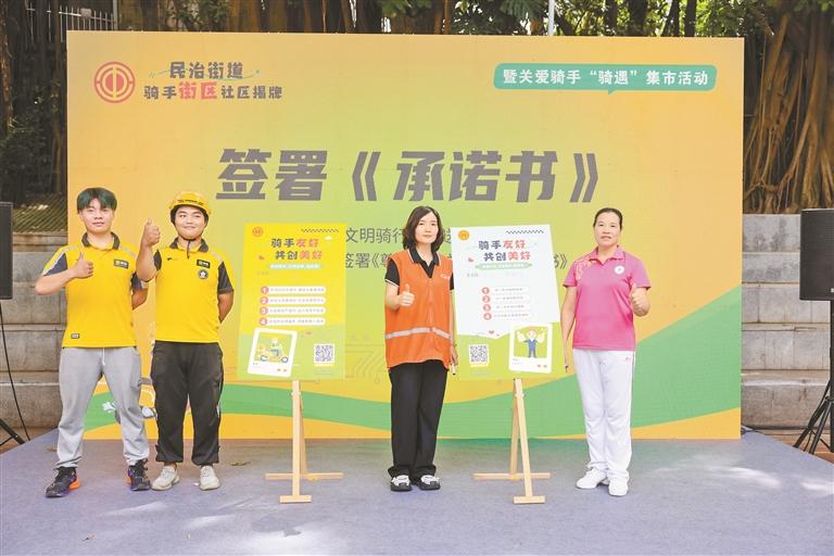 骑手、商家及居民代表签署文明骑行承诺书和关爱倡议书。