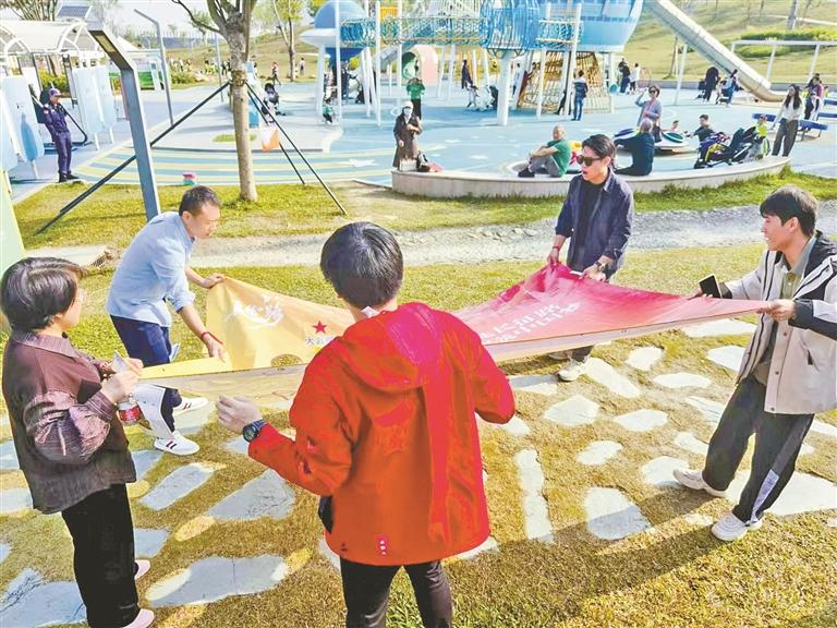 随着一声令下,参赛人员用脚步丈量城市,用智慧解决问题,完成“同走长征路”“同心同行”“共渡难关”“同心竞答”四大任务。“同心同行”,队员需排成一列,依靠泡沫砖逐步前行,过程中不能触地,这一任务考验团队间的信任与协作。“共渡难关”,在不触碰界线的前提下,团队需共同谋划取水策略,展现团队默契。“同心竞答”,对统一战线历史知识进行问答,检验了队员们的知识储备,也加深了大家对统战工作的理解与认同。