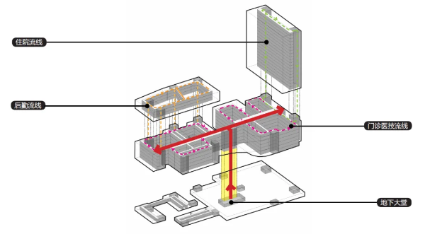 用地东临主要道路,展示面较长,设置为主入口,引出东西向生长轴及南北向医疗轴的十字轴线体系。东西轴预留西侧与医院未来发展连接的空间;贯穿南北的医疗主街将行政、门诊、医技及住院有机地串联起来,提高了医疗救治效率,同时也预留了未来连接北侧公园的可能性。