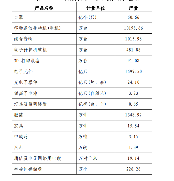 表 1:2022 年规模以上工业主要产品产量表