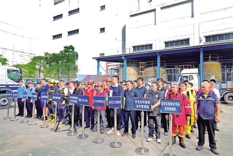 龙华区委宣传部、区工业和信息化局、区水务局、区卫生健康局、市生态环境局龙华管理局、区消防救援大队、龙华供电局、市公安局龙华分局、龙华交警大队、市交通运输局龙华管理局、各街道办、深超光电(深圳)有限公司、空气化工产品(深圳)有限公司龙华分公司、区危险化学品应急救援队等相关负责人以及区、街道、社区、企业四级应急救援队伍共计100多人参加了演练。