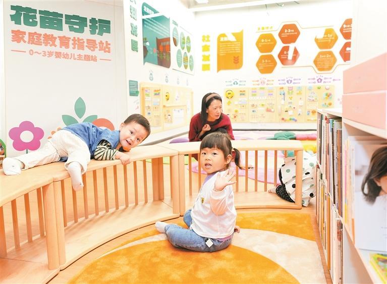 色彩明亮的布局设计,随处可见的育儿教材,可供婴幼儿探索的艺术角,让家长休憩的阅读角……指导站设“语言发展”“认知发展”“社会发展”“艺术发展”“身体发展”五大主题区域,为父母提供各种辅助教育的学习材料及科学育儿知识;空间布置围绕“讲、玩、观、教”等需求设计,促进家庭成员间的合作、分享、互相关爱及亲密陪伴;内容形式上,开设五大类别家庭教育课程,助力婴幼儿养成良好的学习及心理习惯,实现家长对婴幼儿的高质量陪伴。截至目前,指导站开展了96场次科学育儿早教课,服务约400组家庭。