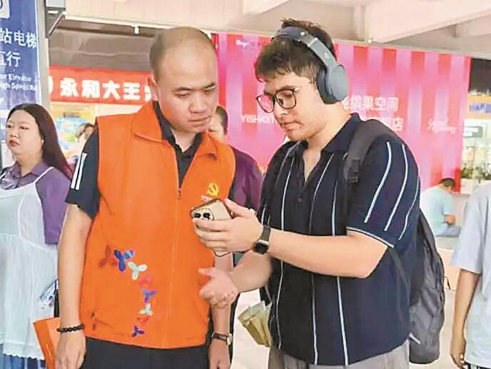 在庞大且人流交错的交通枢纽中,志愿者们如同“活地图”,不仅熟知每一条捷径,更深谙不同旅客的出行痛点。他们为携家带口的旅客规划最快的路线,为迷路的外卖小哥指点迷津,甚至耐心协助旅客解决手机程序故障,成功申领地铁乘车码。