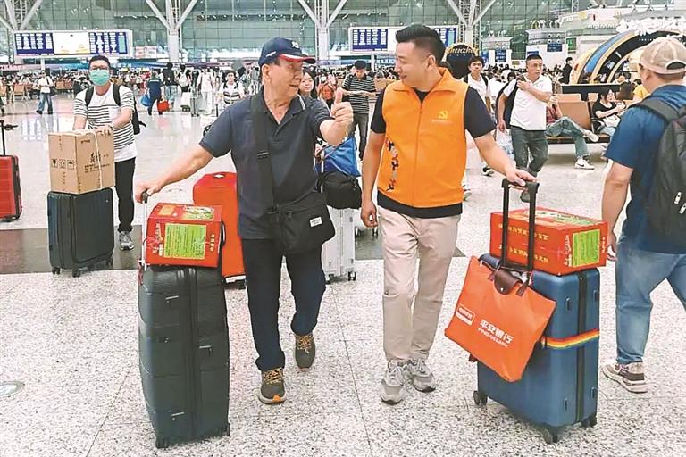 志愿者们俯身安抚与家人走散的孩子,助其重回父母怀抱;主动接过行李,一路护送乘坐轮椅、步履蹒跚的老人安全抵达闸口;为携带婴儿车、负重前行的家庭分担重物,全程引路。一位被安全送达的老人竖起了大拇指衷心点赞,这无声的瞬间,生动诠释了志愿者们“老吾老以及人之老,幼吾幼以及人之幼”的深情。