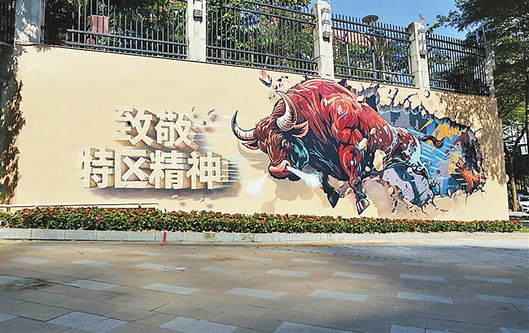 这面墙毗邻高铁北站门户,是展示城市形象的重要窗口。画面中破墙而出的“拓荒牛”筋骨遒劲,蹄踏风云,眼中燃烧着特区初生时的火种。