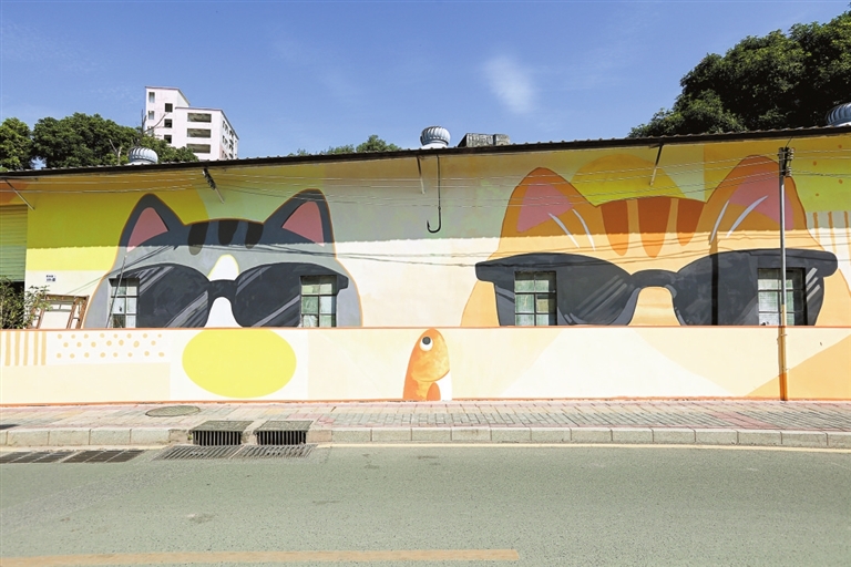 观澜街道鹅地路旁,原是仓库的老房子似被施了魔法的童话之境。两只萌猫俏皮地探出脑袋,窗户隐藏在它们的墨镜中,表情狡黠又温柔。