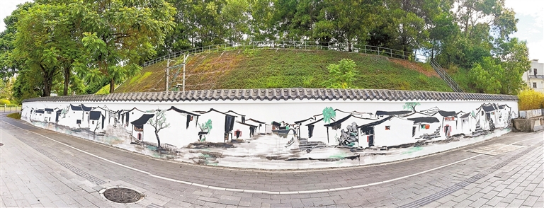 福城街道龙澜大道与观天路交会处,一幅40米长的水墨长卷静静铺展,以东方美学抚慰都市心灵,让快节奏的城市保有一隅诗意栖居。