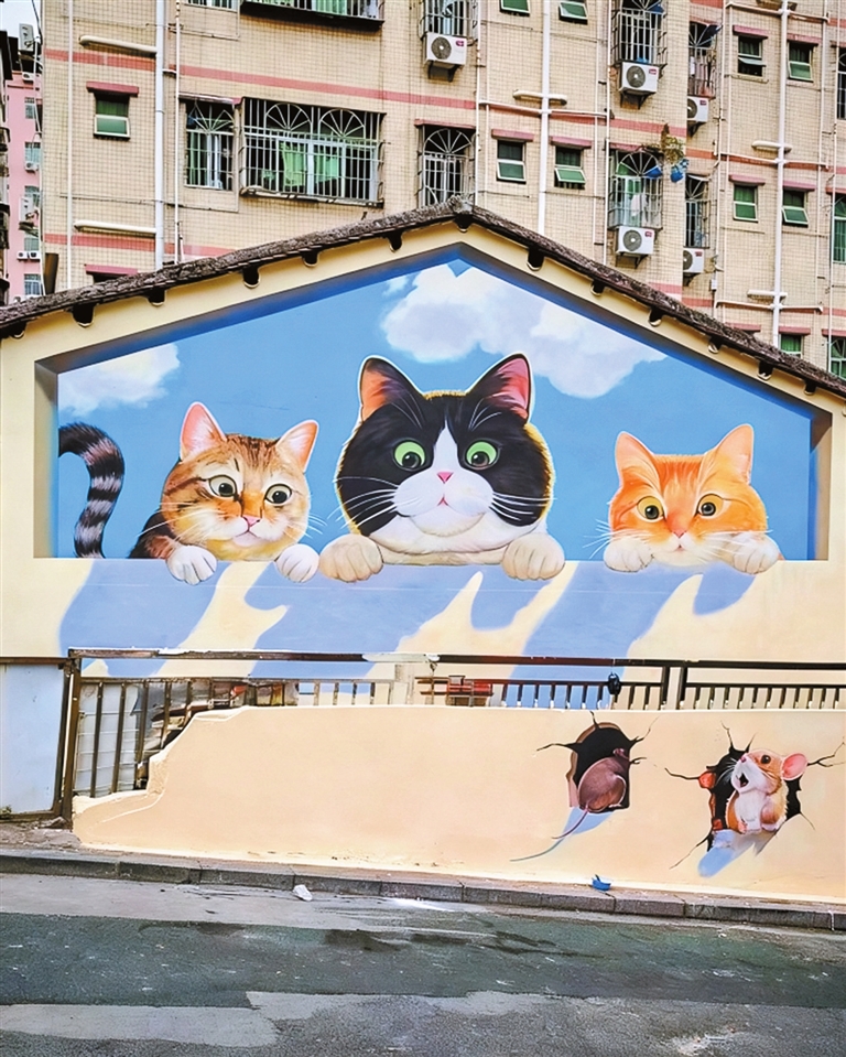 观湖街道大和村,两面高低错落的墙体被巧思化为妙趣横生的立体画布,让二维画面拥有了三维叙事。三只猫咪趴在墙头探头俯瞰墙角下的两只老鼠,眼神各异,憨态可掬,引得路人纷纷驻足,举起手机定格这份灵动。