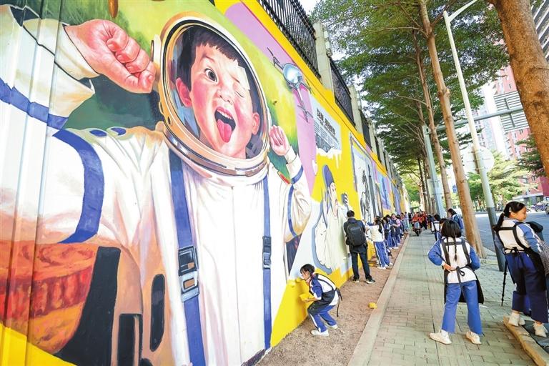民治街道北站社区玉龙学校,一面长达111米、高4.5米,总面积近500平方米的作品,是本次墙绘活动最大的“鸿篇巨制”。
