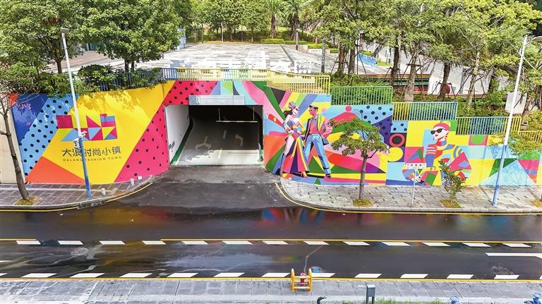 沿着大浪街道浪逸道缓步前行,一道长达30米的彩色长卷徐徐展开,如同一条流动的T台,将“大浪时尚小镇”的灵魂倾注于墙面之上。墙绘以大胆的几何色块、跃动的剪影人物与极具张力的线条,勾勒出一座被时尚气息浸润的现代街区。