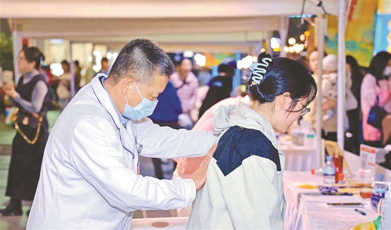互动区里欢声笑语不断,投壶赢治疗券、药材盲猜赢香囊等游戏让市民在玩乐中学习中医知识。一位小朋友举着刚完成的山楂核书签自豪地说:“医生教我认了枸杞和菊花,以后我要提醒爸爸少喝酒,多喝养生茶。”诊疗区的医生们耐心细致,为市民讲解体质辨识结果,不少上班族特意赶来体验肩颈推拿,直呼“比去医院方便多了,还能学到实用养生技巧”。