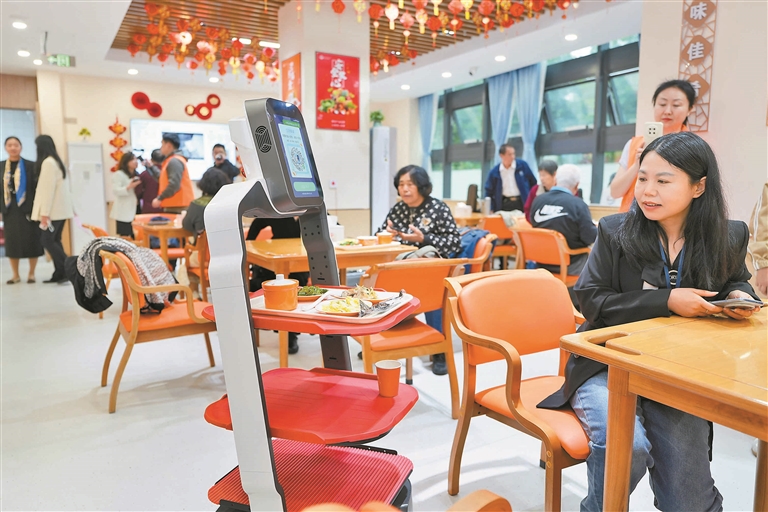 嘀的一声“刷脸吃饭”、智能机器人穿梭服务、AI全程巡查食安监管……这是红山社区长者智慧食堂的日常场景,水榭春天小区的熊阿姨和牛叔叔常来这里用餐,他们接过餐盘,在智慧系统引导下轻松完成全流程就餐,早已熟悉这一便捷操作。