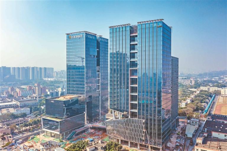从地铁四号线竹村站C出口出来,可以看到未来人才大厦项目已经拔地而起,三栋包裹着银灰色玻璃幕墙的高耸大楼格外气派,大楼上“龙优创新谷”的标牌在阳光照射下熠熠生辉。项目现场,间或还有工程车辆出入其中,工人们正在忙着进行项目的收尾工作。