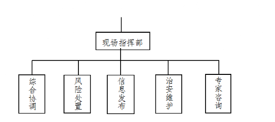 现场指挥部下设综合协调、风险处置、信息发布、治安维护、专家咨询5个应急处置工作组,由指挥部办公室视情况抽调成员单位工作人员集中办公。