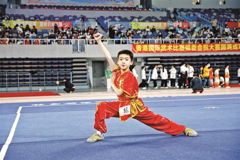 赛事期间,开展了成人套路比赛、少儿套路比赛、深圳市第五届武术散打比赛以及中国武术段位制考评。图为少年武者展示身手。