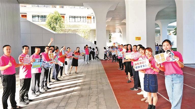 在观澜中学考点,老师们手拿高考励志牌为考生加油。