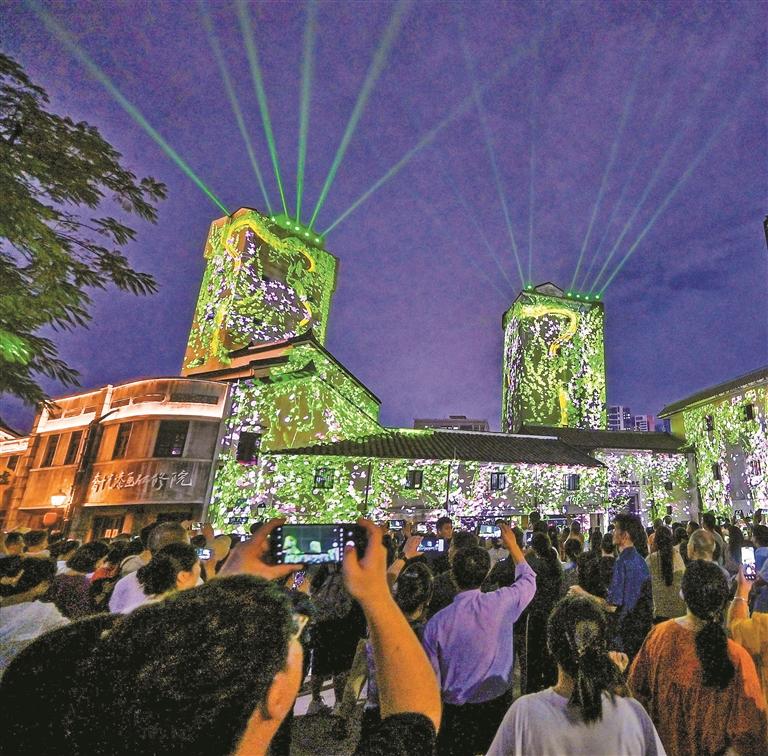 市民欣赏观澜古墟灯光秀。