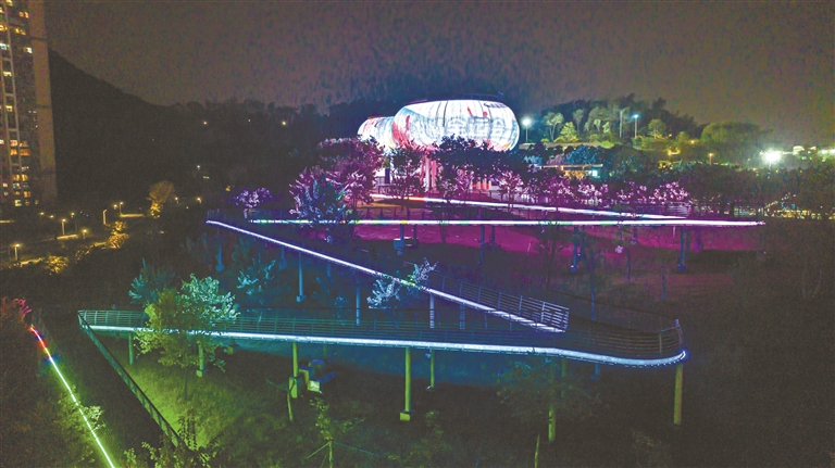 门户区域的形象升级同样亮眼:梅林关新增8杆融入传统中式元素的景观路灯,显著提升“中轴”夜间风貌的品位与辨识度;北站中心公园次入口以“飘带”为设计灵感,种植500余棵“市花”簕杜鹃,打造出长度达200米的连续花带,同时协同深圳北站管理方,启用深圳北站及北站中心公园云顶书吧的景观照明,结合时段动态展示十五运会主题标语,塑造出独具龙华魅力的夜景名片。