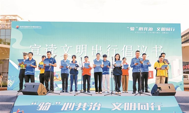 新就业形态劳动者、学生、志愿者、城管、交警等各方代表共同宣读《文明出行倡议书》。