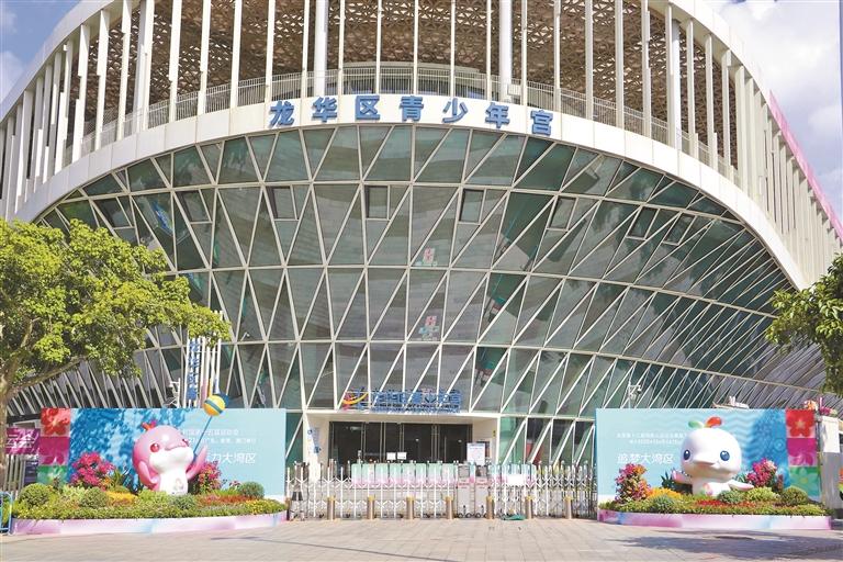 龙华文体中心入口的赛事吉祥物景观小品憨态可掬。