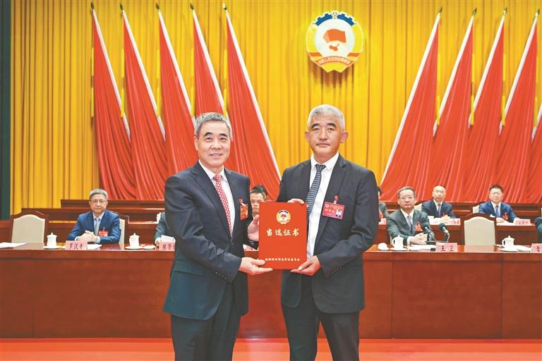 区政协主席熊佩锦(左)为新当选的二届区政协秘书长王晓洋颁发当选证书。