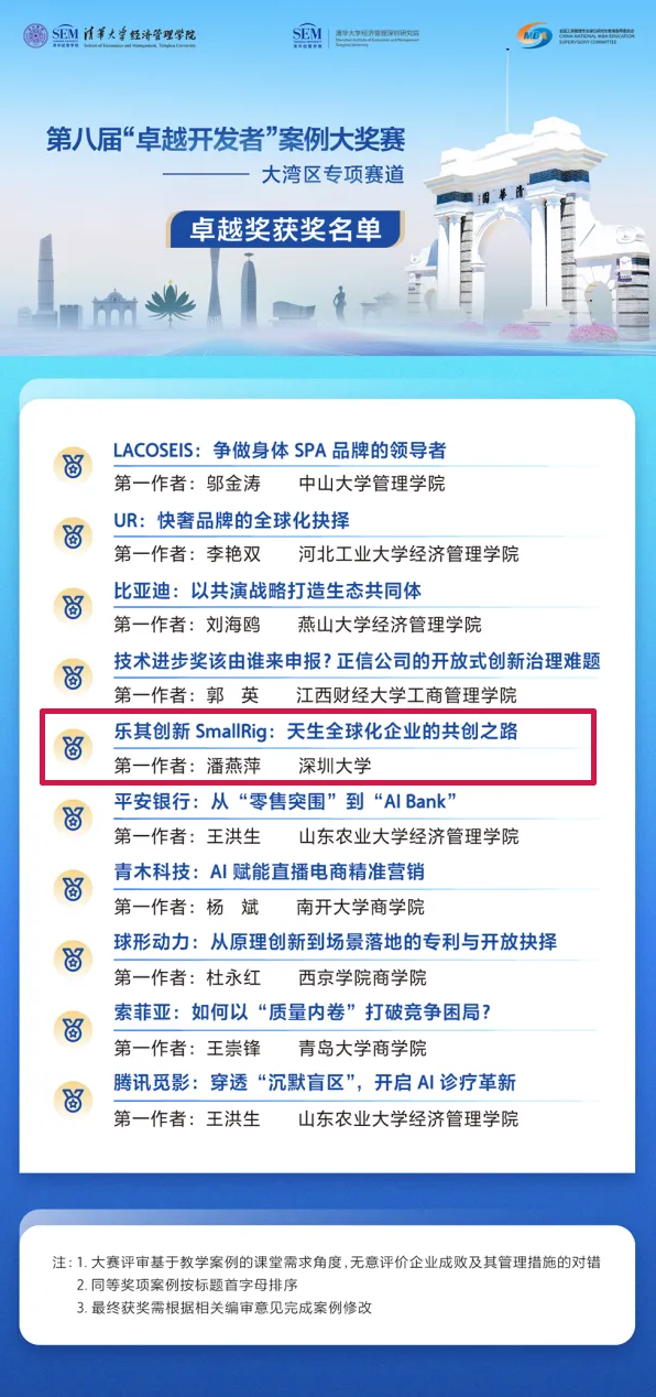 近日,清华大学第八届“卓越开发者”案例大奖赛获奖名单公布,深圳大学管理学院教师潘燕萍团队携手龙华企业深圳市乐其创新股份有限公司联合开发的教学案例《乐其创新SmallRig:天生全球化企业的共创之路》荣获大湾区专项赛道卓越奖。