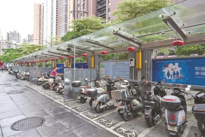 在白石龙一街某电动自行车集中停放点,一排电动自行车整齐停放。近段时间以来,深圳市进一步加强电动自行车治理工作。王卫现场要求,民治街道和区应急部门要联合交通、交警等相关部门,加强联动、通力协作,进一步加强对电动自行车规范治理,尤其是要加强对违法改装、加装等行为的整治。同时要加强电动自行车文明出行宣导,规范电动自行车停放,加强电动自行车违规行驶整治,保障人民群众安全有序出行。