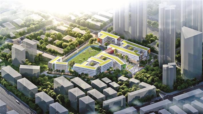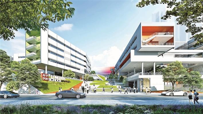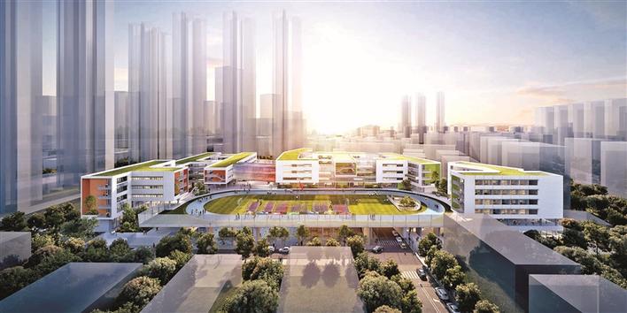 据介绍,龙华学校设计新颖且富有时代气息,明快、清新、舒适、生态。设计时充分考虑九年一贯制学校学生的特点,校舍做到分区明确,互不干扰,便于管理。18班中学教学区设置在校园南侧,36班小学教学区设置在校园北侧。体育运动区位于校园西侧,其中操场抬升6.4米,满足地下通廊净高要求,并在其下方置入共享功能组团。为使学校交通便利顺畅,防止机动车进入主要教学及活动区域造成环境污染和安全隐患,学校交通规划实行场地“人车分流”,并结合学生的课余活动特点布置相应的活动及疏散广场。校园主入口位于校园东侧中部,可便捷到达小学区、初中区。