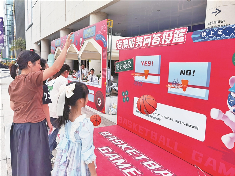 除了高效便捷的业务办理,活动现场还设置“港澳服务问答投篮”互动环节。通过轻松有趣的投篮选择“YES/NO”方式,工作人员引导大家了解跨境消费、移动支付、电信服务等相关政策。来自澳门的李女士参加投篮后兴奋地表示,“我不仅拿到了小礼品,还搞清楚了不少跨境消费的注意事项,希望这样有趣又有用的活动能经常办。”